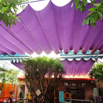 - Bạt dạng lượn sóng: Thiết kế kiểu bạt này rất mới lạ, bắt mắt. Vải bạt được thiết kế đi kèm cùng hệ thống khung bằng inox rất kiểu cách. Bạt có thể thu gọn lại khi không cần che nắng. Sản phẩm này thường được làm từ vải bạt cao cấp. Khả năng chống lại tác động tiêu cực của nắng gắt, mưa dầm rất vượt trội. Đây cũng là gợi ý hay để quý khách trang hoàng cho không gian ngoài trời của quán thêm đẹp mắt, thu hút.